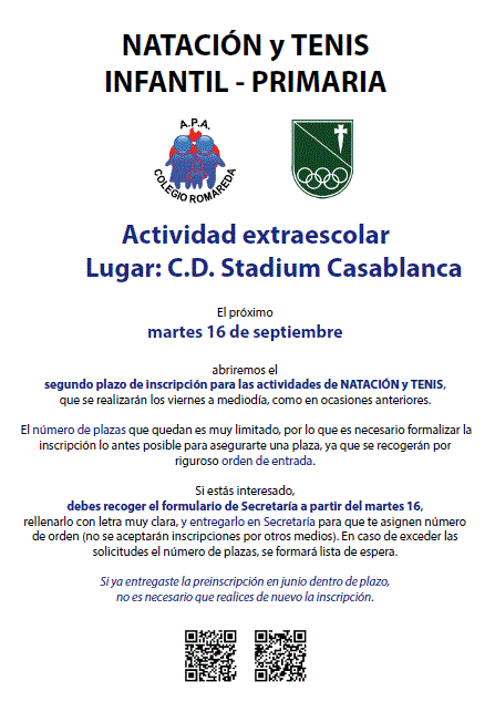 El próximo martes 16 de septiembre abriremos el segundo plazo de inscripción para las actividades de NATACIÓN y TENIS, que se realizarán los viernes a mediodía, como en ocasiones anteriores.
